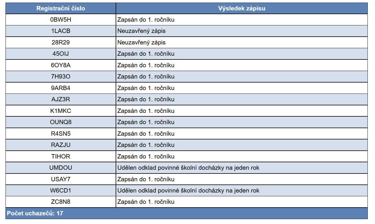 Informativní výsledky zápisu jsou k dispozici v tabulce níže a dále včetně poučení a potřebných formalit v PDF souboru (Rozhodnutí o přijetí.pdf).